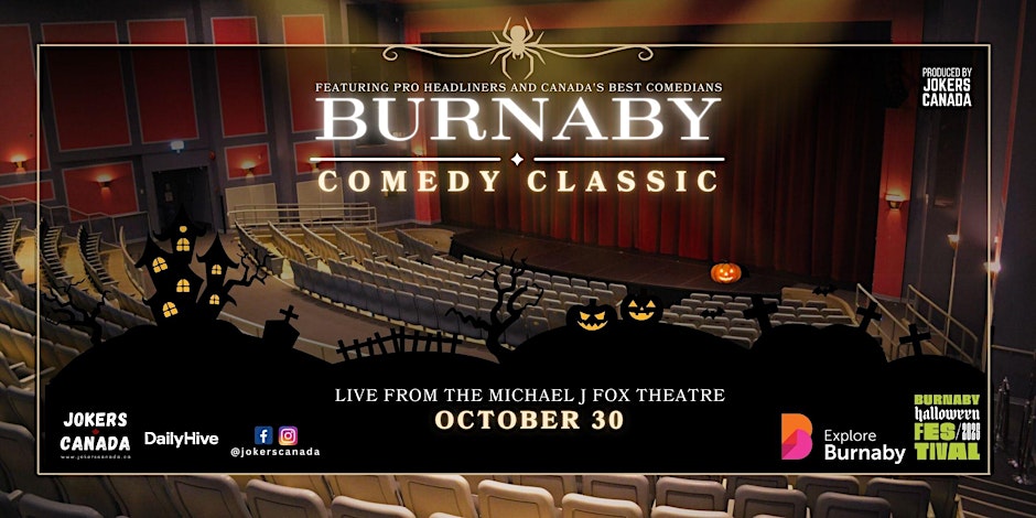 October in Burnaby is already alive, with pumpkin trails glowing, neighbourhoods going all out with spooky displays, and the air vibrating with festival energy. But on October 30 (doors open at 7 pm), Burnaby’s Halloween pulse reaches a crescendo. At the venerable Michael J. Fox Theatre, Jokers Canada is bringing pro stand-up comedy into the heart of the Burnaby Halloween Festival, and we can’t wait for you to be part of it.